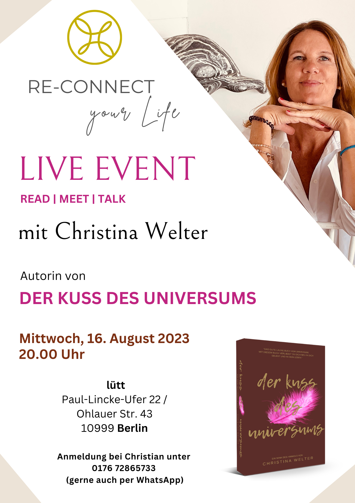 Du findest mich und den “Kuss des Universums” entweder an meinem Weihnachtsstand oder an der Bühne, wo ich aus meinem Buch für Dich vorlese.
